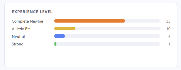 We'd expect this as the workshop is introductory, but most of the registrants are new or relatively new to the Sports, AI and Storytelling space. This is great to see because it means we can help you grow your skills and there's a lot of upside to acquiring and applying the knowledge to your own goals.