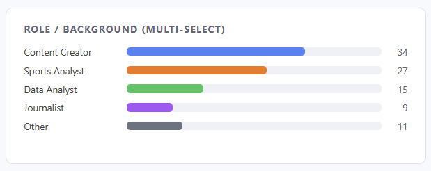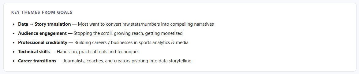 It's super helpful for us to understand who we're talking to – whether it's through our newsletters, data stories, courses, and the like – so this is really good to see. You're a diverse group of creative sports enthusiasts looking to find ways to take data and stats and translate it into stories.
