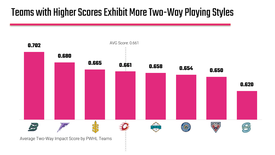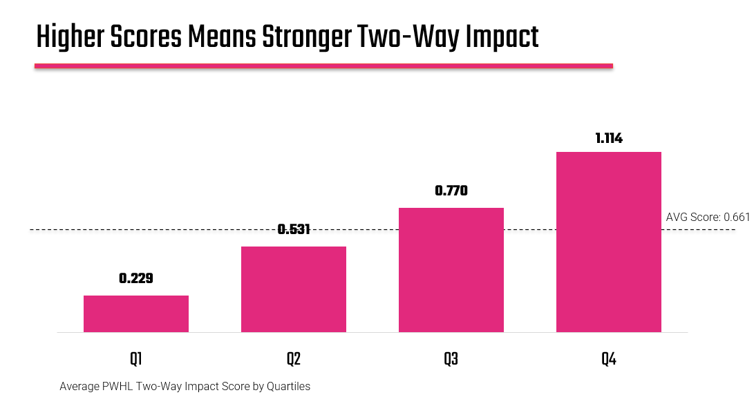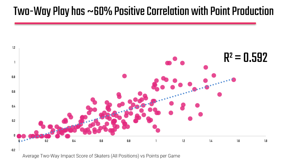 If the correlation were near 100%, TWIS wouldn’t tell us anything new; it would just mirror scoring. If it were near zero, it would suggest that two-way play doesn’t translate to outcomes. But sitting in the middle, around 60%, it tells us something more nuanced: two-way impact contributes to scoring, but it doesn’t fully define it.