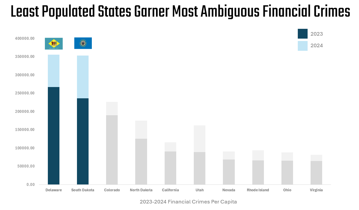 So, here's an alternate view where we reframe Total Count of Financial Crimes through Financial Crimes Per Capita. And the results, as you'd expect, are different and interesting: Delaware and South Dakota are 45th and 46th in terms of population, but first and second, respectively, in Financial Crimes Per Capita. California is still in the top ten, but it is not #1 anymore.