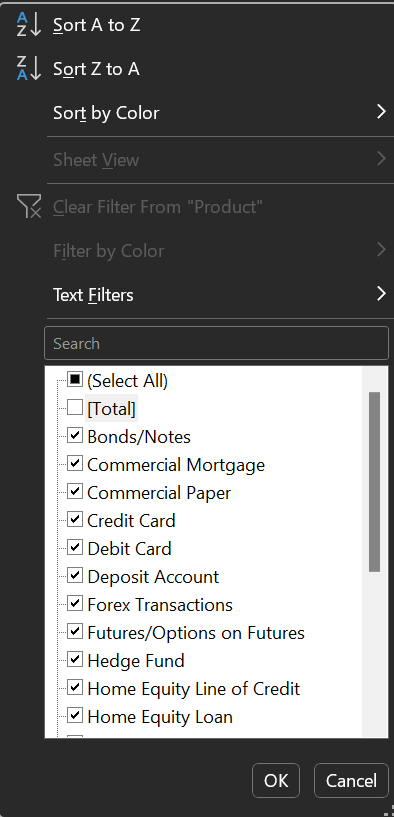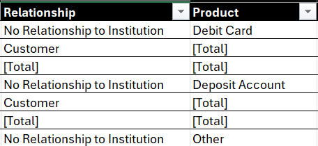 Filtering allows you to view only the rows that meet certain criteria, which helps in focusing on specific segments of your data. For example, in the Relationship and Product columns, you'll see cells with [Total] entries. These represent total values associated with these specific data points. If we filter these out of view, we have a cleaner view to work with.