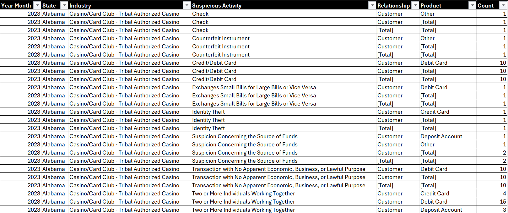 For example, below you can see a newly created and configured PivotTable in Excel. Rows are configured with the State. Columns are configured with Year Month. And Values are configured to Count (with the default Sum of Count selected). Also, we've filtered the Industry, Suspicious Activity, Relationship, and Product to get a clean view on the pervasiveness of the problem across the US.