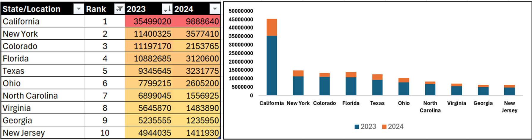 You can then use the PivotTable Fields pane (as in the picture above) to create different summary views for your data. Using the PivotTable results above, we copied and pasted the data into another worksheet – we generally prefer to get data out of the PivotTable. For example, here's the same data, copied into a separate worksheet, where we can now sort in descending order. Right away, we can see that in 2023, the top five states were California, New York, Colorado, Florida, and Texas.