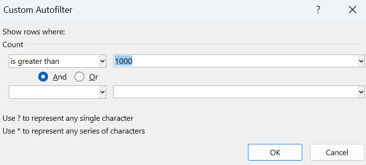 - Filter the Count column to only have totals greater than 1,000. (Click the filter icon in the Count column heading, select Number Filters, Greater Than, and in the Custom Autofilter dialog type 1000 in the text field.
