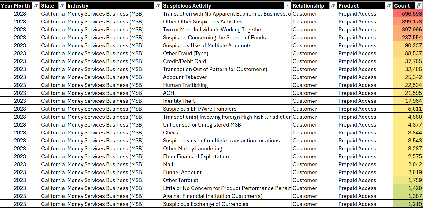 With the above sorting, filtering and conditional formatting applied, you should now have the following view. Hopefully, you can see that the heatmap is an effective tool to call out the highest- or lowest-occurring values. In this case, we can see that Transactions with No Apparent Economic, Business, or Lawful Purpose have the highest incidence of occurrence in the MSB industry within California.
