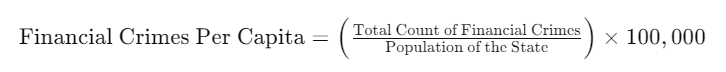 We always try and think about our data stories as human stories. And within financial crimes, there is a person (or a business where people work) who are victims of the crime. So, rather than thinking in terms of total count, we can couch this data in terms of Financial Crimes Per Capita. To do this, you divide the total count of financial crimes by the population of the state and multiply by a factor (commonly 100,000) to express the metric in a standardized form (e.g., per 100,000 people).