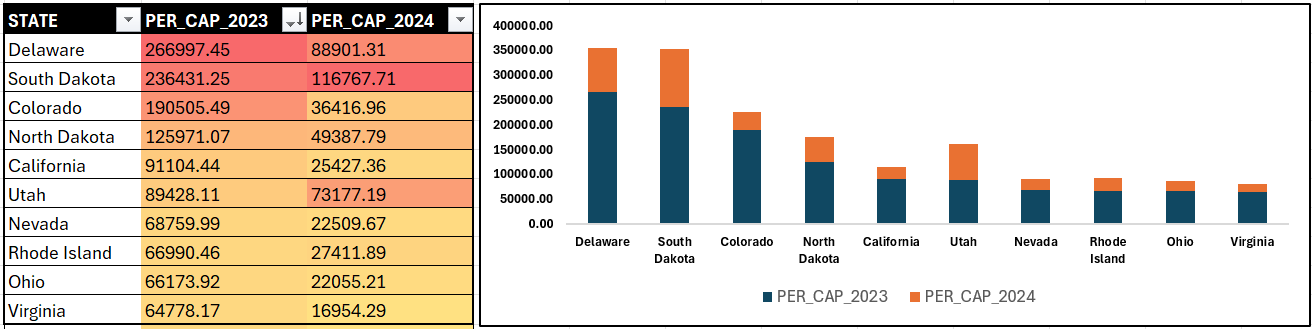 So, here's an alternate view where we reframe Total Count of Financial Crimes through Financial Crimes Per Capita. And the results, as you'd expect, are different and interesting: Delaware and South Dakota are 45th and 46th in terms of population, but first and second, respectively, in Financial Crimes Per Capita. California is still in the top ten, but it is not #1 anymore.