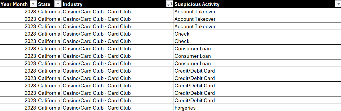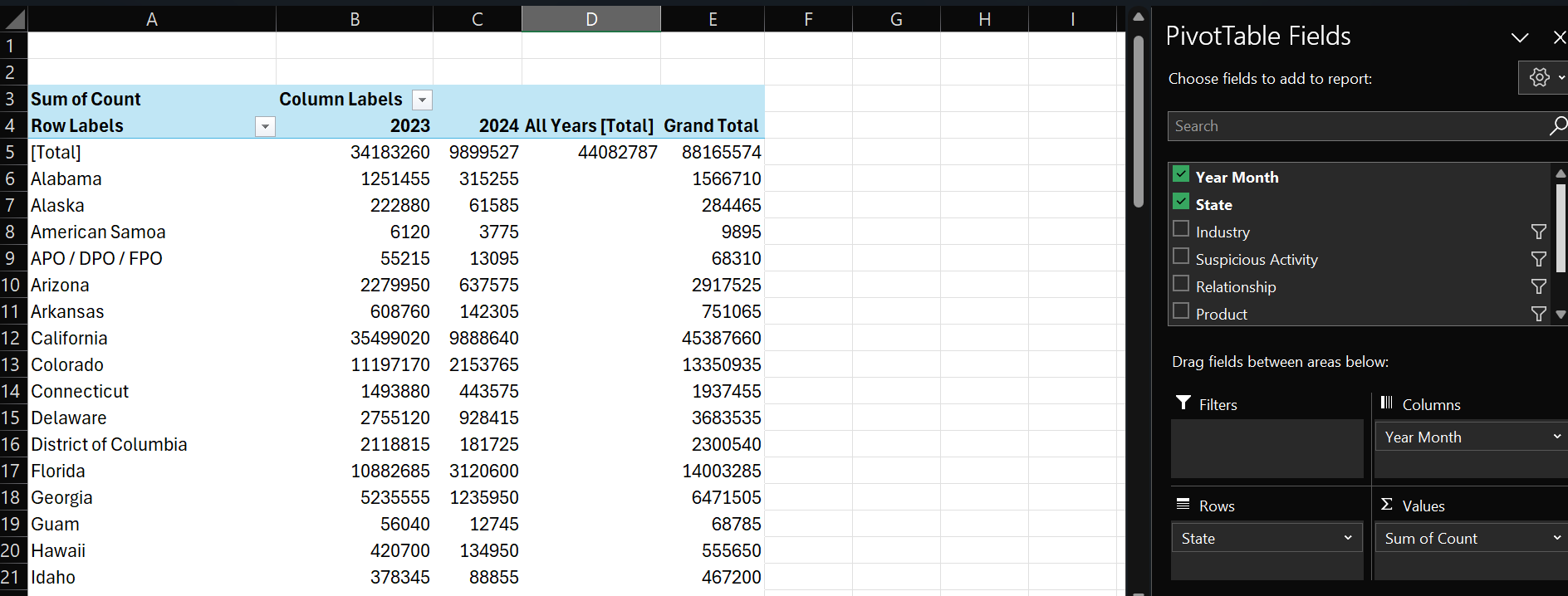 For example, below you can see a newly created and configured PivotTable in Excel. Rows are configured with the State. Columns are configured with Year Month. And Values are configured to Count (with the default Sum of Count selected). Also, we've filtered the Industry, Suspicious Activity, Relationship, and Product to get a clean view on the pervasiveness of the problem across the US.