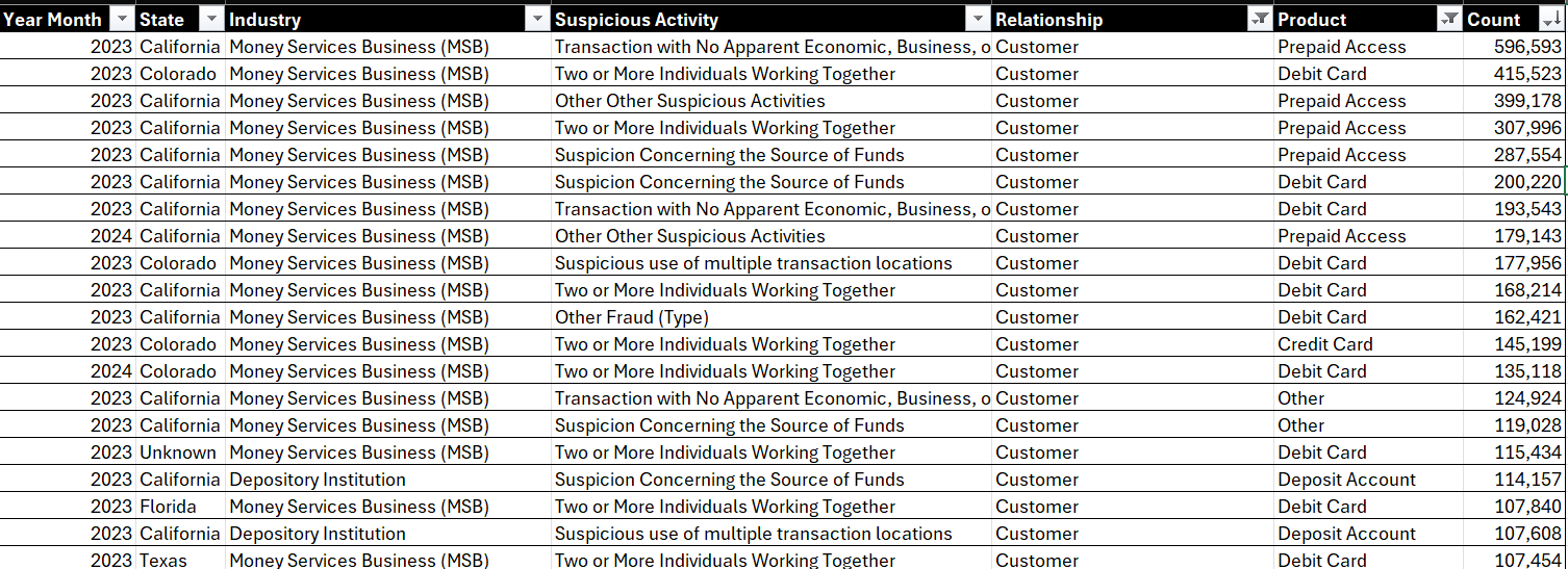 Let's now go back and apply the sorting technique and select Sort Largest to Smallest in the Count column. You now get a clean, sorted view that shows the financial crimes with the highest incidence; that is, Transactions with No Apparent Economic, Business, or Lawful Purpose, classified as a Money Services Business (MSB), occurring in California in 2023, with Customers being the main victim, using a Prepaid Access product.