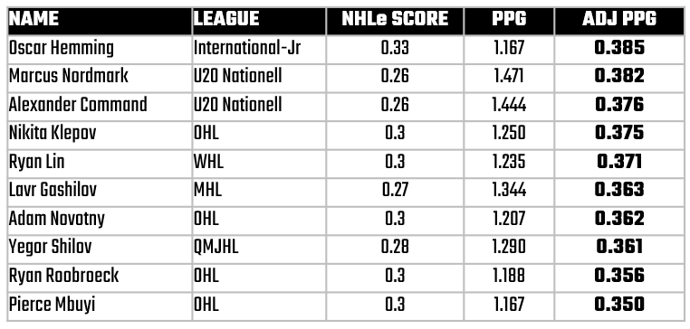 For the NHL, there's a nifty statistical tool you can use called the NHL Equivalency metric (NHLe). The NHLe provides what is tantamount to a conversion score that you can use to standardize Points per Game from different leagues into a 'standard' representation.
