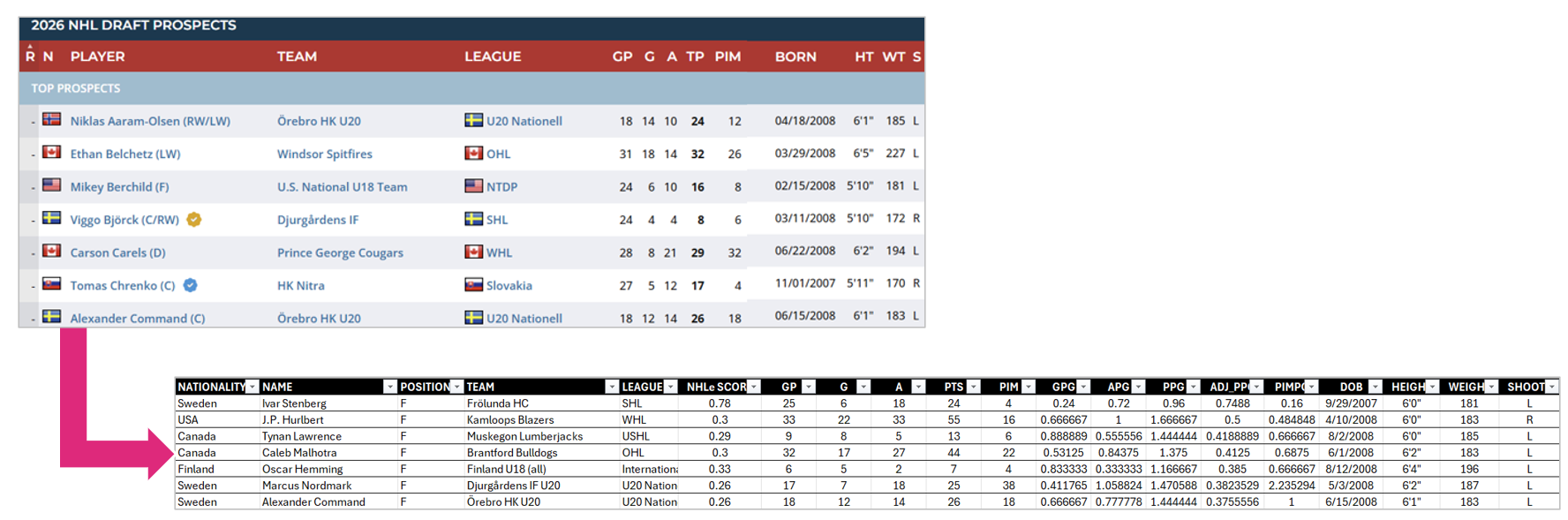 However, if you wanted to distill their data and reporting into a single, ranked list and then do your own analysis, you need to get the data into a spreadsheet so you can do the analysis. The EP Draft Center is a good first step to get updated statistics on NHL prospects for such an analysis.