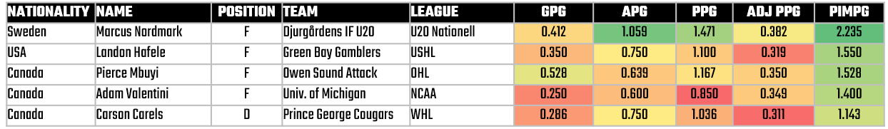 Take Marcus Nordmark, for example, who is performing above the average Adjusted PPG (ADJ PPG) in the top quartile of our dataset (which is 0.380). He can convert, but is over twice as strong in his passing game. So, overall he has a strong Adjusted PPG of 0.382. However, he also has the highest PIM per Game (PIMPG) in the top 100. He's a decent size at 6'2" and 187 pounds, but is the high number of penalties a problem or would it self-correct in the NHL?