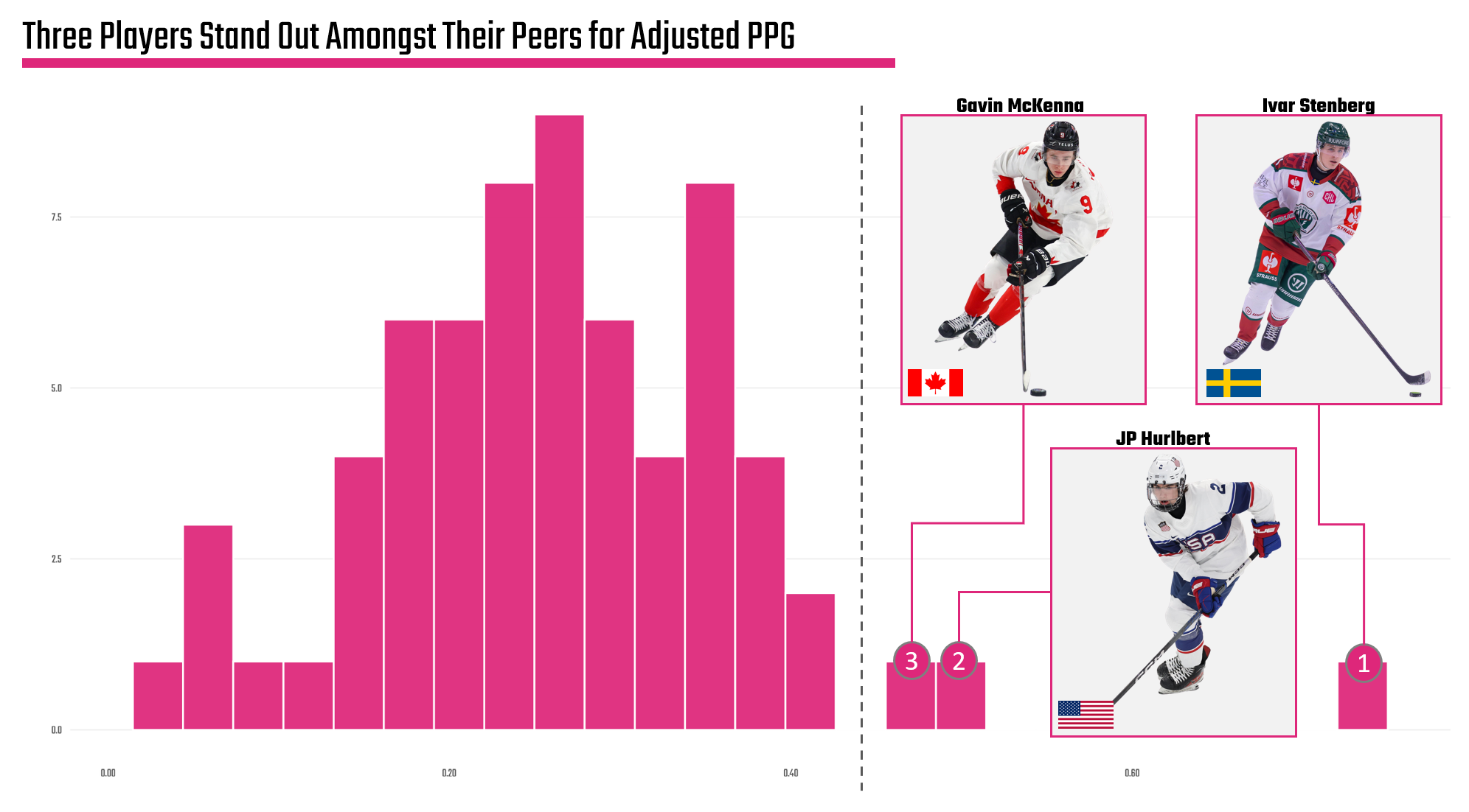 Honestly, this is where we would land. We'd do a treatment of the top 3 forwards as a 'tip of the hat', but quickly move to the outlier. Why? It's fun, more simple for an audience to engage with and frankly brings Sweden (who contribute 10% of the NHL's players) into a more prominent frame. We personally love the influence that other countries bring to the NHL, so there's a lot of potential for angles here – be it nationality, a surprise front-running prospect, or focus on passing game as key to the outlier.