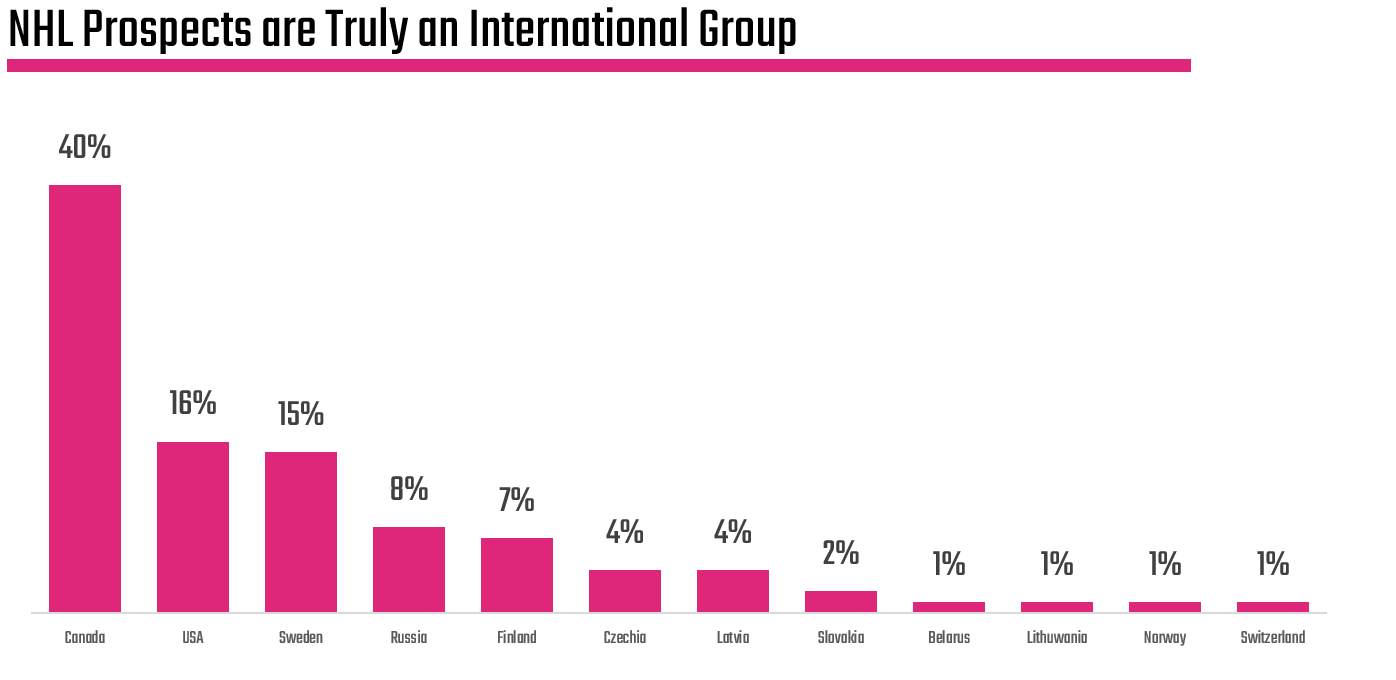 As you can see from the below, out of the dataset we pulled from Elite Prospects, there is a diverse set of countries represented here. This translates into different development programs, different styles of play, ways of living and cultures, ice surfaces, quality and sizes, and much more.