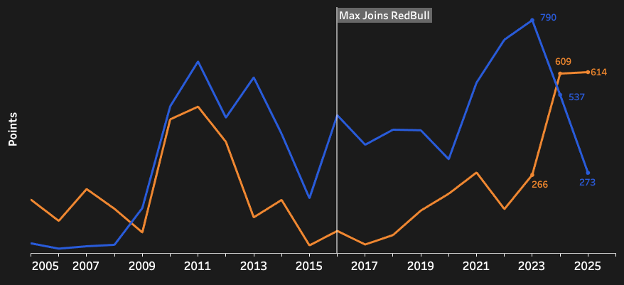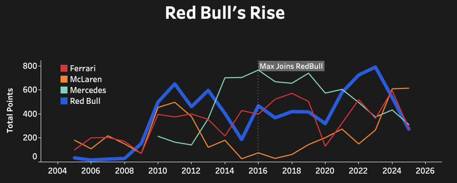 Few eras in Formula 1 history had been as dominant or as meticulously built as Red Bull’s run over the past five seasons. As shown in the graph below, the team’s climb began long before the trophies arrived. Max Verstappen joined Red Bull in 2016, and while his raw speed was obvious from day one, it wasn’t until 2020 that the pieces truly fell into place.