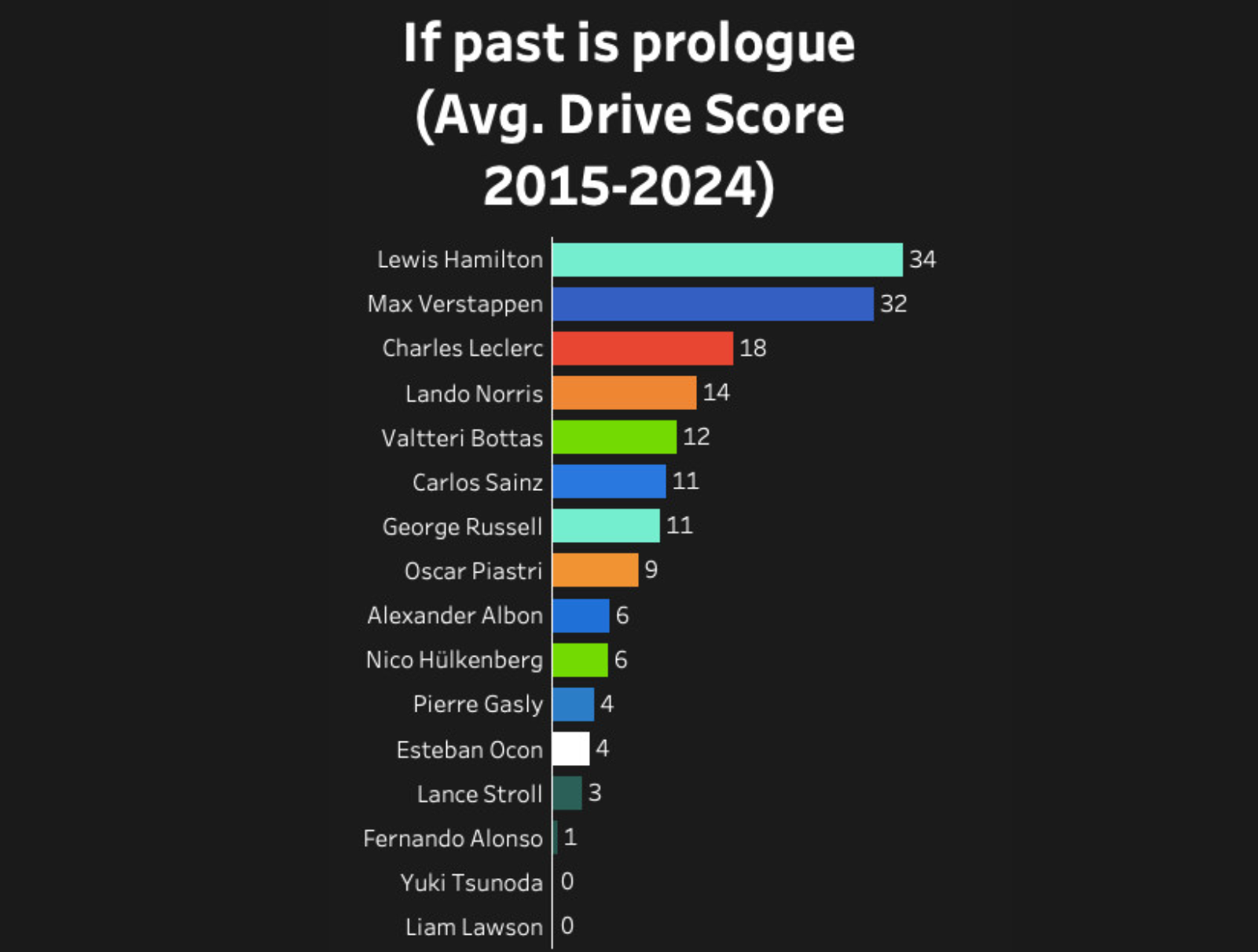 That resurgence made Mexico City feel like the perfect storm for Verstappen – a track where both history and form aligned. Our Drive Score chart below, “If Past is Prologue,” reinforced just how dominant both he and Lewis Hamilton had been around the Autódromo Hermanos Rodríguez, sitting atop the all-time leaderboard for performance at this circuit. Hamilton’s record in Mexico remains one of the most consistent in the hybrid era, and with both drivers showing flashes of their old brilliance heading into the weekend, it felt like the stage was set for another classic chapter between two of the sport’s defining talents.