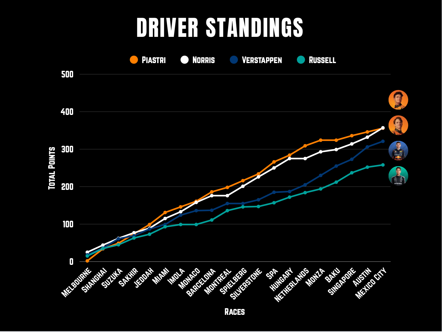 With four races remaining, the 2025 Drivers’ Championship has become a three-way showdown, with one longshot still mathematically in the mix. Lando Norris’s victory in Mexico City earned him 25 points and returned him to the top of the standings for the first time in 189 days, reclaiming the lead he lost to his McLaren teammate Oscar Piastri after the Saudi Arabian Grand Prix earlier this season. Norris now leads with 357 points, just one ahead of Piastri's 356.