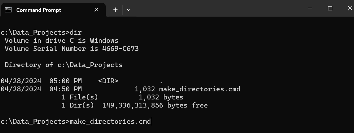 - Save the file into the root of where you want to run the script, e.g.: c:/Data_Projects/make_directories.cmd.