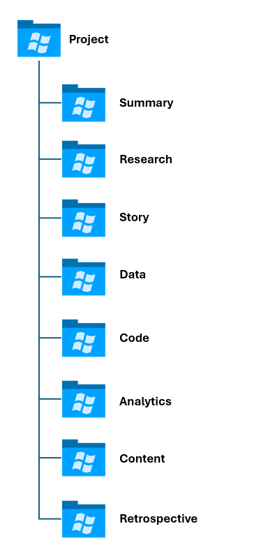 The process of creating an overview document should give some shape to the project, so the next step is to get a folder hierarchy created. The folder hierarchy will house the different parts of your project – for example, storyboards, data, analyses, and so on. For our projects, we use a folder structure similar to the below.