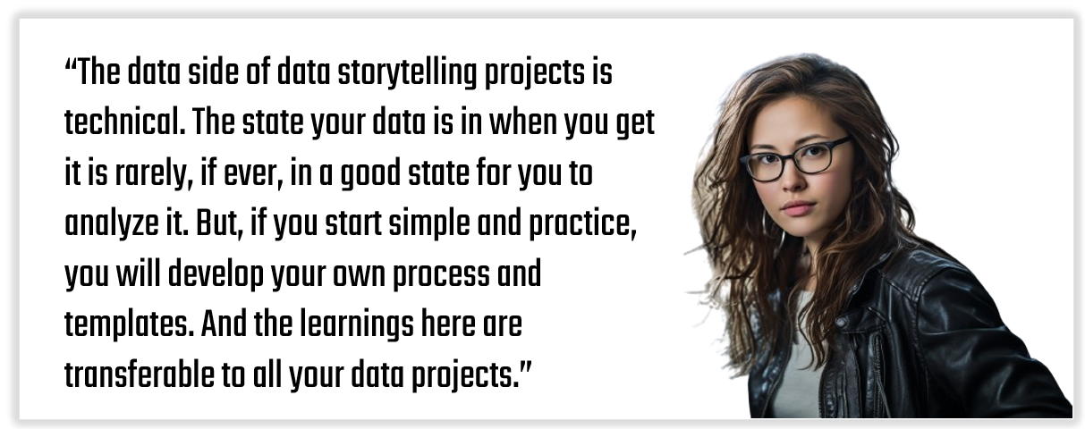 Further, the reality is that managing the data within your data story can command specific skills. For example, you may require a programmer to write a web scraper or build a data ingestion script in Python. And then the data needs to be cleaned, transformed and normalized so you can adequately analyze the data. Thus, the data sourcing, ingestion and preparation phase can take time. But, after you get the data into a format and structure that can be analyzed, things tend to speed up. Also, like anything, the more you work with data, the more you'll know how to get through the hurdles.