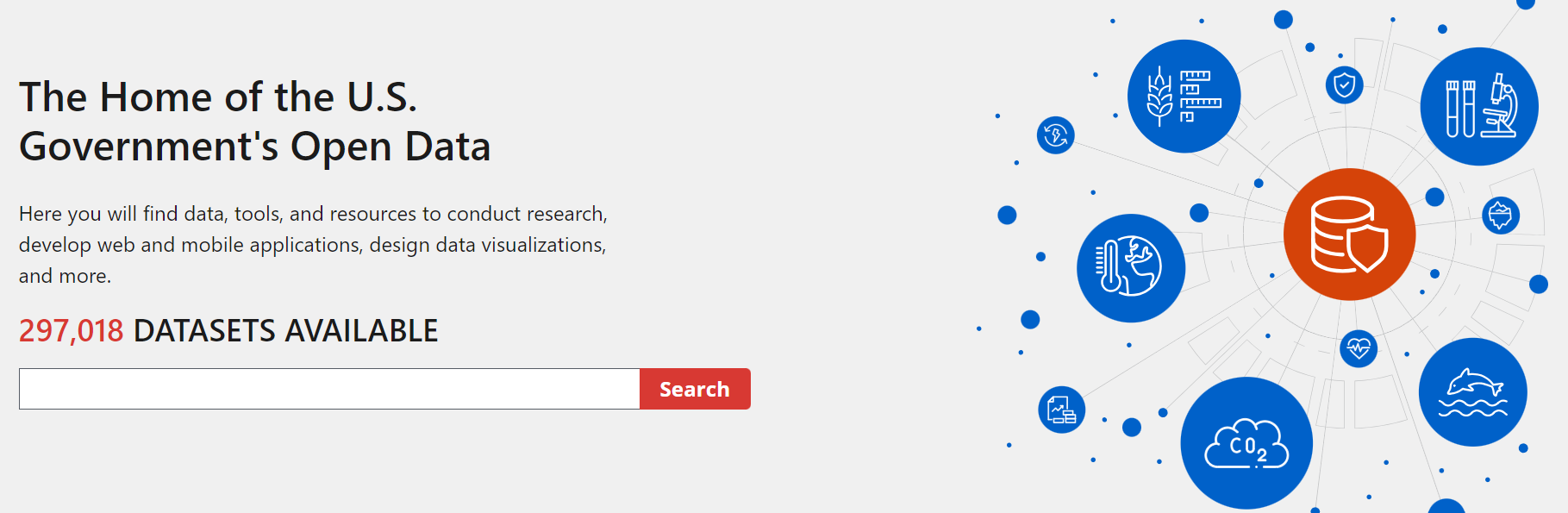 Many governments, organizations, and research institutions make datasets publicly available for free or for a fee. These datasets cover a wide range of topics such as demographics, economics, health, education, and more. One example of an open government data source is data.gov, which you can see below includes thousands of searchable datasets.