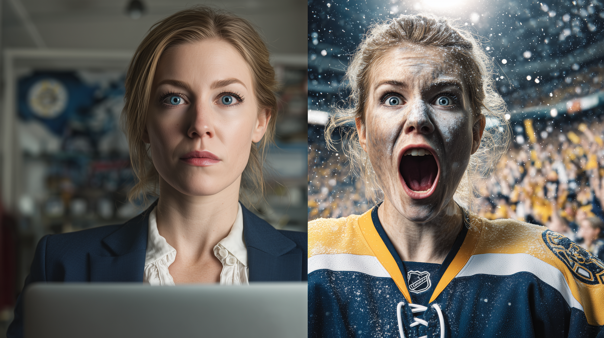 "Create a portrait of the same woman shown in two contrasting identities. The left side: a professional female office worker, polished appearance, wearing business attire (blouse and blazer), holding a laptop or paperwork, clean corporate office environment, neutral lighting, calm expression. Right side: the same woman transformed into an intense Boston Fleet hockey superfan inside TD Garden, face painted in navy and gold, wearing a Boston Fleet jersey, hair slightly messy from cheering, screaming with excitement, hands raised or holding a rally towel, energetic arena lights, crowd blur, confetti or motion blur for atmosphere. Both sides should have full face to shoulders, and the difference should reflect polar opposites. Strong visual contrast between calm professionalism and explosive fan passion. Cinematic lighting, crisp detail, 8k resolution, hyper-realistic textures, bold sports energy."