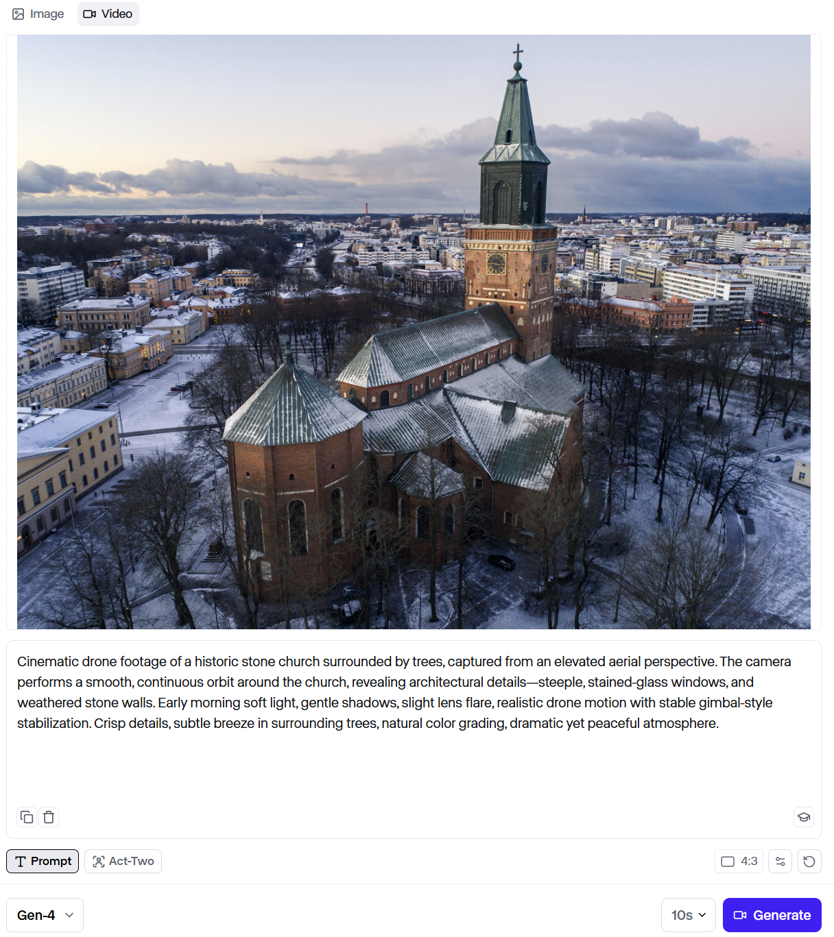 Assuming the clip comes out the way you want it to, you can use this as more specific context for Susanna Tapani – giving the viewers some context as to where she comes from. Using the above prompt, Runway did a great job of a high pan-around shot of the church and surrounding area.