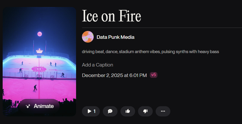 Our input was pretty simple: fun dance beat for a hockey game. The result was a song called "Ice on Fire" with a decent beat, catchy lyrics and generally a fun vibe.