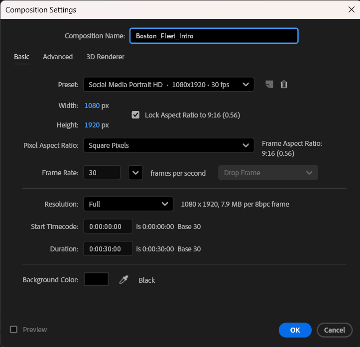 To create a composition, open Adobe After Effects, and click Composition and New Composition. This opens the Composition Settings dialog, where you can configure your composition. Give your composition a name, and then click OK.