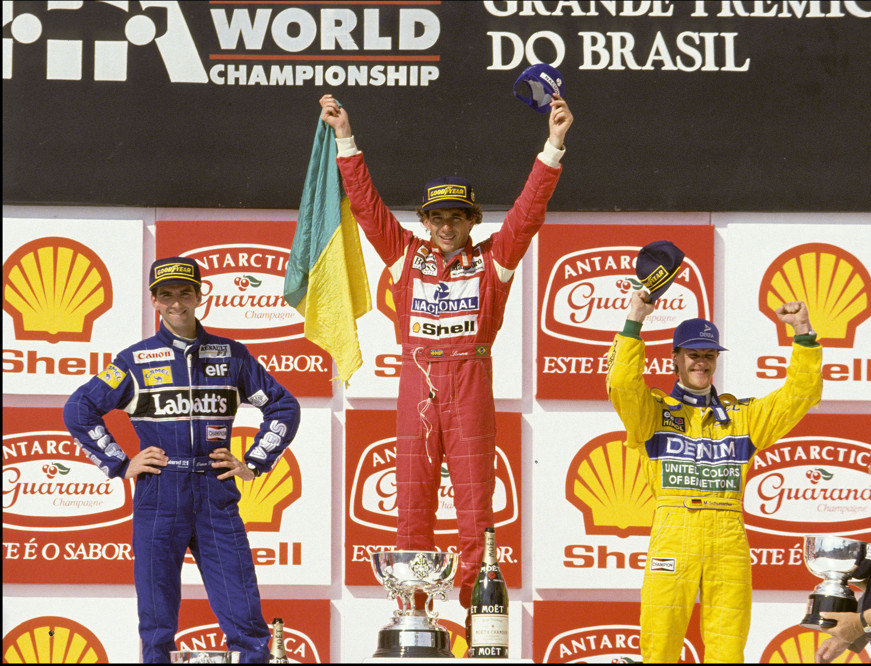 After years of heartbreak at home, Ayrton Senna finally won the Brazilian GP, but with a jammed gearbox, leaving him stuck in sixth gear for the final laps. He fought the car across the line, screaming in pain as he took victory in front of his countrymen.