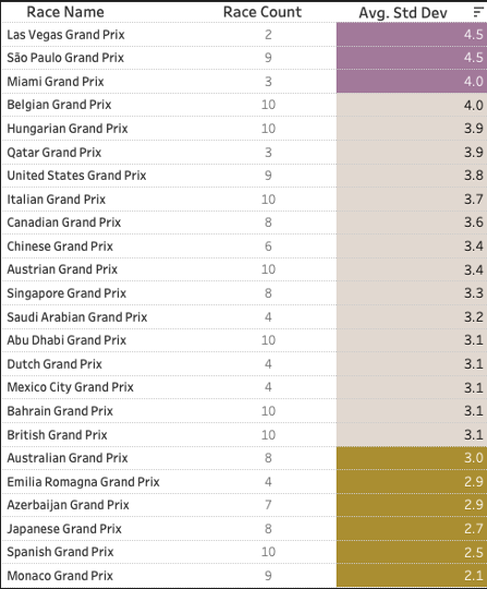 Everyone feels the chaos at Interlagos, but the numbers prove it. Using a standard deviation metric that tracks how much drivers’ finishing positions differ from their qualifying order, Brazil ranks number one on the F1 calendar with an average deviation of 4.5, tied only with Las Vegas.
