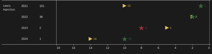 The data backs it up. As shown in the chart below, the yellow triangles mark Hamilton’s starting positions and the green and red stars mark his finishing positions across the last four Brazilian Grands Prix. He has almost always outperformed his starting position at Interlagos, averaging a +2.5 place gain per race. It’s proof that when volatility spikes, Hamilton thrives and transforms unpredictable races into opportunities for mastery.