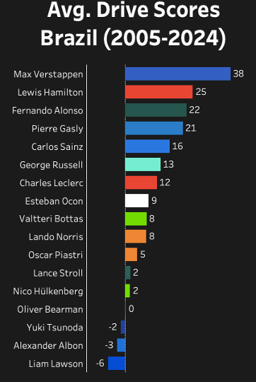 As shown in the chart below, Max Verstappen leads all active drivers in Brazil with an average score of 38, followed by Lewis Hamilton at 25, making them the two clear standouts at São Paulo. Their dominance isn’t coincidence; both have proven capable of turning unpredictable conditions into calculated execution.