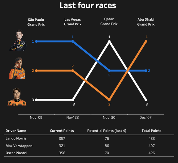 To project how the rest of the season could unfold, we built a composite model based on our Drive Score metric for each driver. For the more unpredictable and chaotic circuits of Brazil and Las Vegas, the model placed greater weight (40%) on past results to reflect how chaos can magnify experience, and 60% on current-season form. For Qatar and Abu Dhabi, where outcomes tend to follow car pace more closely, the weighting flipped, with 20% based on past performance, and 80% on current 2025 form. The result is the projection shown below – a statistical roadmap to the season’s end.