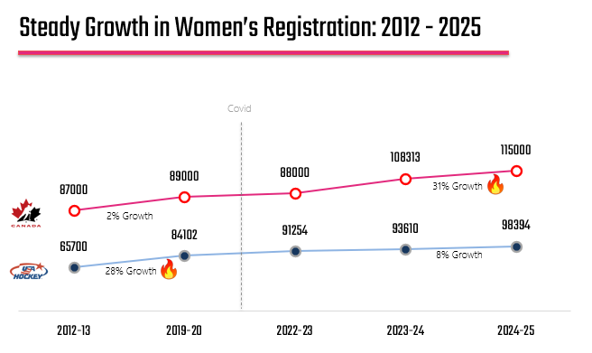 In the United States, participation grew from roughly 65,700 players in 2012–13 to over 98,000 in 2024–25. Canada, already operating from a higher base, remained steady before accelerating to approximately 115,000 players in the most recent season – with a post-Covid growth spike of 31%.