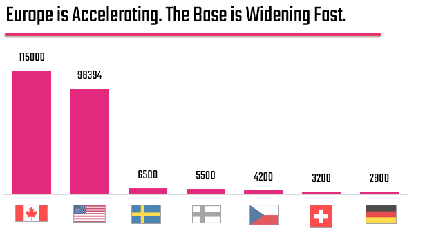 But women's hockey goes beyond North America. The below chart compares women’s hockey participation across regions, particularly between North America and Europe. The implication here is that while the United States and Canada remain the dominant contributors, an important shift is emerging: growth is no longer confined to a single geography.