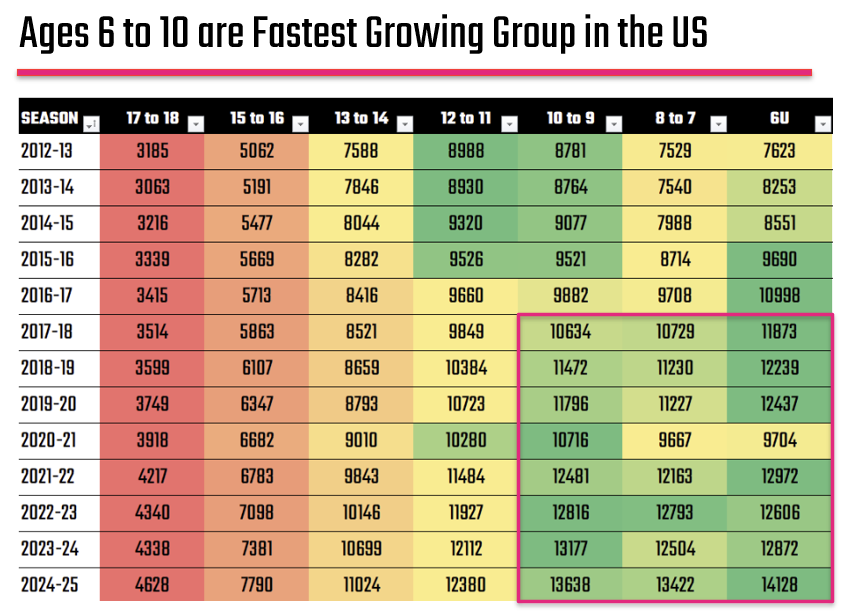 While total participation and North American development programs are important, it doesn’t tell the full story. To understand where the sport is heading, we need to look at who is entering it (and at what age).
